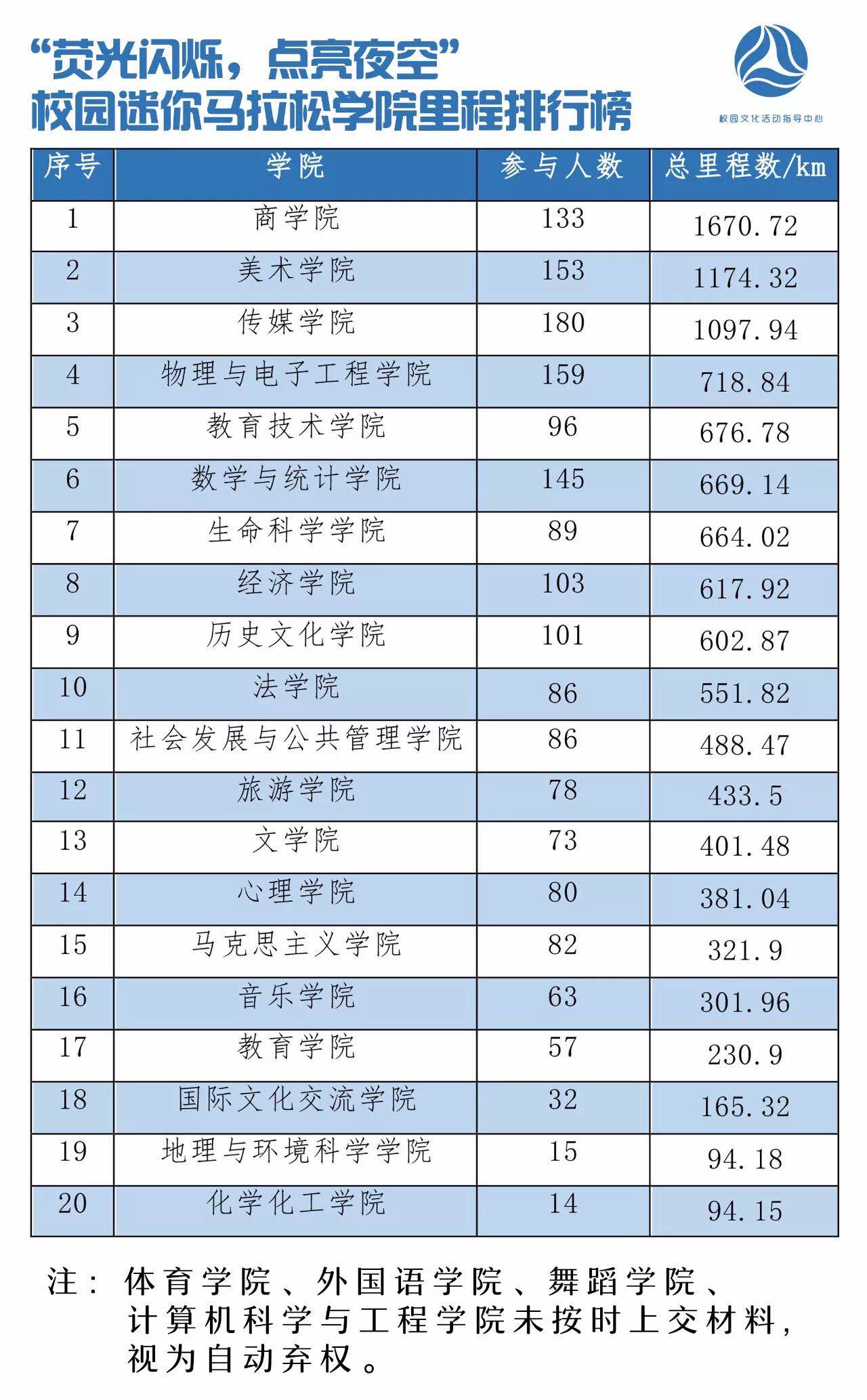 12月1日晚上7点,“荧光闪烁•点亮夜空”校园迷你马拉松暨“奋进师大”大学生主题跑活动在kaiyun电子平台西操场正式启动,本着“青春不宅 酷跑筑梦”的主题,全校学生走下网络,走出宿舍,走向操场。kaiyun官网团委书记赵洁老师带领学院180名学生到场参加。kaiyun电子平台获得团体总分第三名,总里程达1097.94千米。