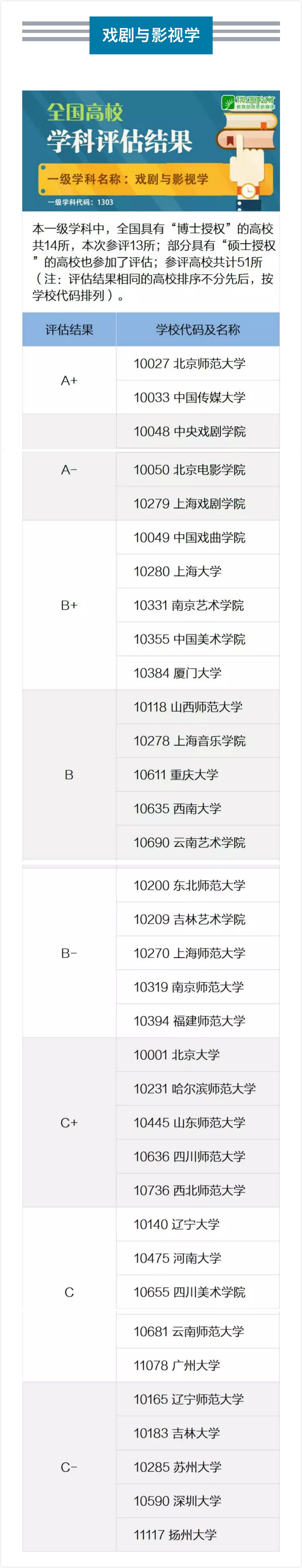 我校参评的28个学科中,教育学为B+,中国语言文学、数学为B,马克思主义理论、外国语言文学、物理学、化学、地理学、美术学等6个学科为B-,心理学、体育学、中国史、音乐与舞蹈学、戏剧与影视学等5个学科为C+,其他学科没有进入前70%。kaiyun官网戏剧与影视学排名西北第一,西部第四。