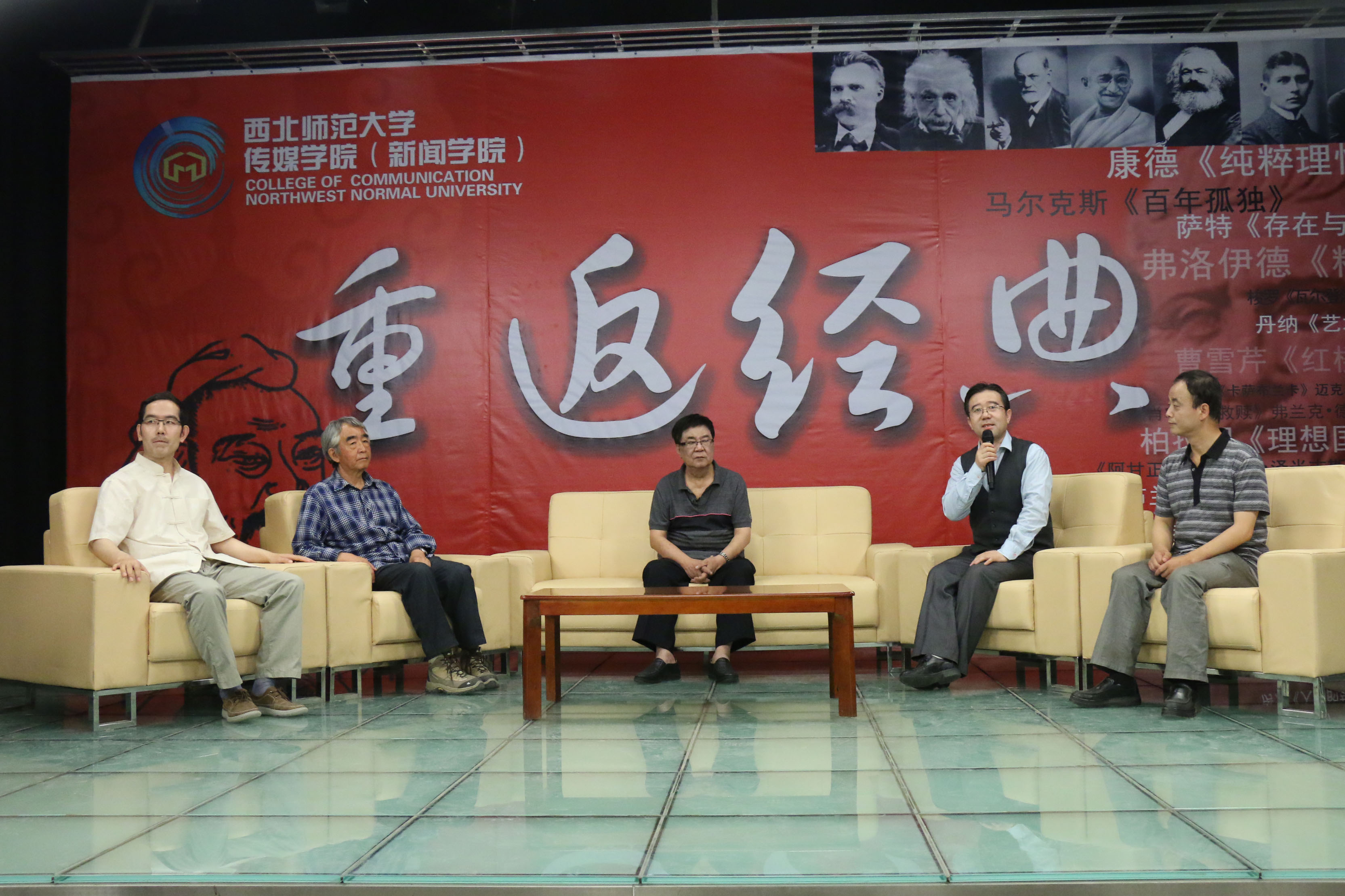 “重返经典电视大讲堂”,在重读经典的过程中,传承人类文化、构筑精神家园、创新教学模式、陶冶学子情怀、对话人生哲理。“重返经典”系列活动分讲、抄、诵、演、行几个板块,“讲”,就是开设电视大讲堂,邀请省内外的知名学者来解读经典著作和经典影视作品;“抄”就是让师生抄写经典诗文;“诵”,就是通过朗诵会、诗会诵读经典;“演”,就是通过话剧、情景剧、短剧等演绎经典;“行”,就是倡行礼仪,践行经典。电视大讲堂邀请校内外专家学者分专题讲授,同时,每期还邀请校内外相关专家学者进行互动讨论发言。活动全程录制并在电视台播出。目前,重返经典已经邀请校内外文化学者、专家教授李敬泽、陈思和、白烨、陈传席、范鹏、王登渤、贺雄飞,赵逵夫、王鉴、李并成、李朝东、彭金山、韩高年、马世年、曹进、马如云等举办了30余期。