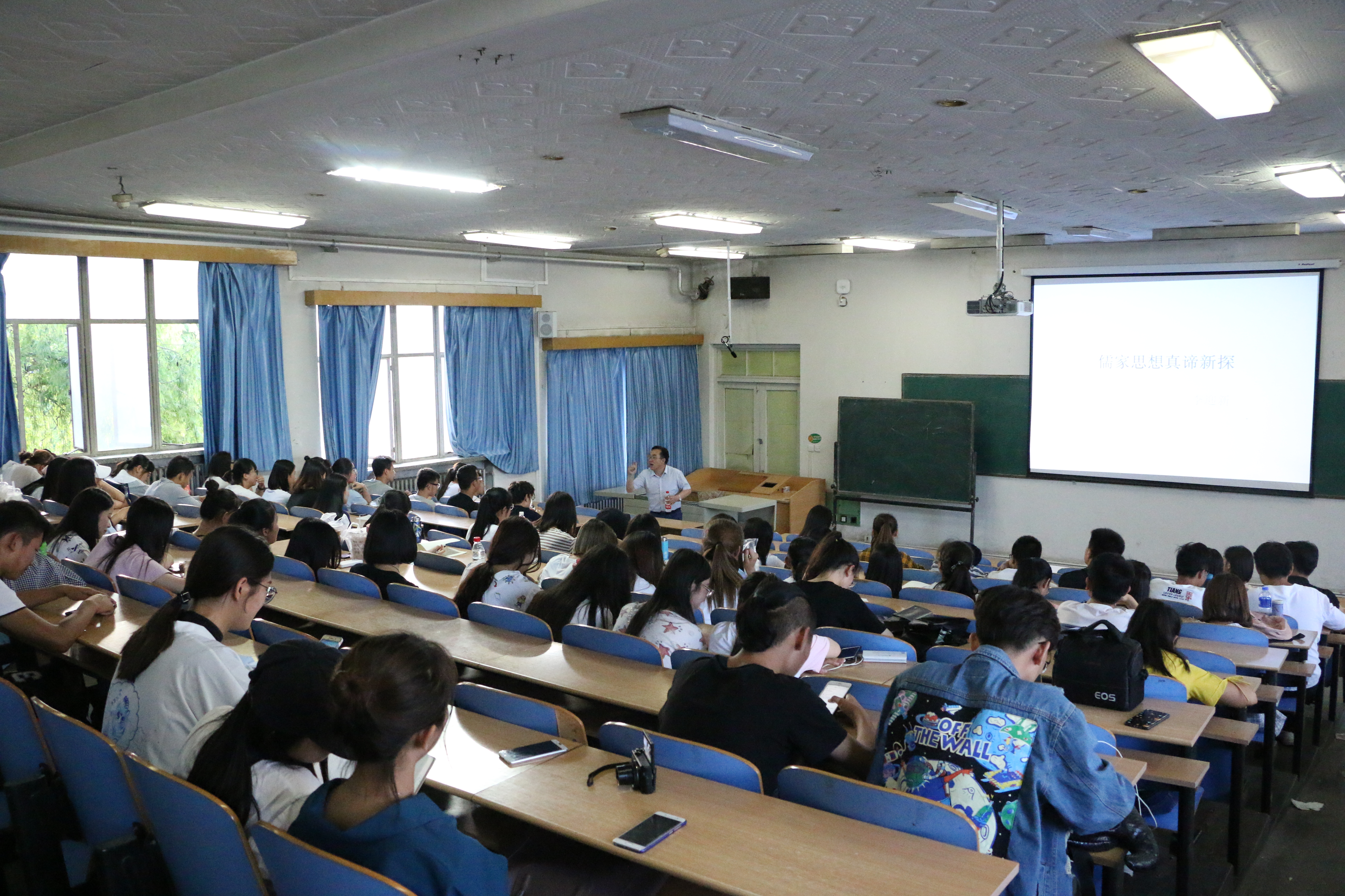 他一边讲解,一边启发大家思考问题。在讲到“夫子之道,忠恕而已矣”时,他指出“忠恕”的“忠”是忠于自己的内心,劝告大家做事要坚守自己的原则,“恕”则是宽容理解他人,“忠”和“恕”是相辅相成的。接着他指出一些被篡改和误解的儒家思想,他先让大家谈谈自己的理解,又深入浅出地讲解了它的正确内涵。