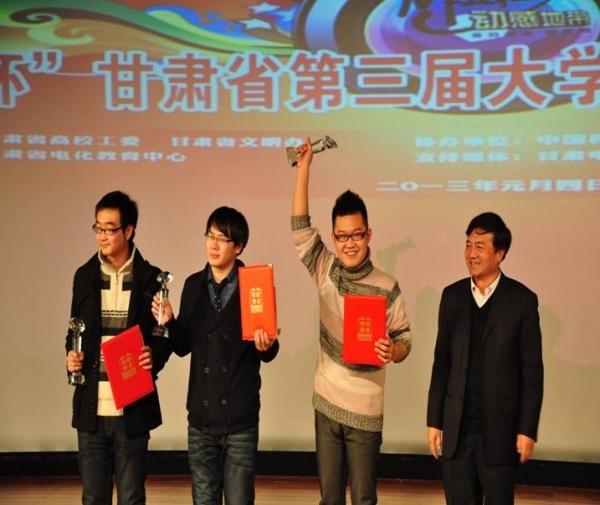 1月4日下午,由甘肃省高校工委、甘肃省文明办联合主办,甘肃省电化教育中心承办,中国移动通信集团甘肃有限公司和兰州大学协办的“动感地带杯”甘肃省第三届大学生DV创作大赛颁奖典礼在兰州万商国际飞天影城隆重举行。kaiyun电子平台靳刚等九位学生创作的8部作品获奖,其中2008级广播电视编导专业学生张跃龄的《坏爸爸》、王子元的《大良的菜刀》和2009级播音与主持艺术专业学生靳刚的《时间游戏》等三部作品包揽大赛一等奖;刘涛、任志明、孟子为、张浩、张立潮等五位老师被评为“优秀指导教师”。同时,我校被组委会授予“优秀组织奖”。