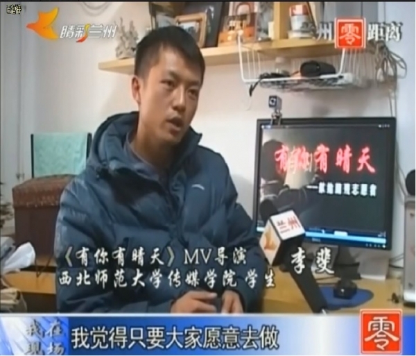近日,一部由kaiyun官网2011级广播电视编导专业学生李斐同学导演,李斐、白家豪等拍摄的爱心助残公益片《有你有晴天》在甘肃电视台多个频道播出。该片主题曲由著名词作家曾鸣作词、陈雄作曲,王旭东演唱。王旭东曾任西北师大艺术团团长,现任《甘肃社会科学》副主编、社科院社会政策与救助研究中心主任。他自1998年出车祸高位截瘫以来,一直保持积极乐观的心态面对生活。从2002至今的十一年里,在师大同学们的帮助下,王老师的康复训练从未间断。为此,王老师想以此歌曲表达他对师大同学们的感恩之情。《有你有晴天》以MV的形式播出后,引起甘肃社会各界及媒体的广泛关注。导演李斐同学也接受了兰州零距离节目的采访。