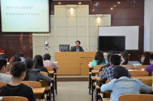 马成鸣做了题为“践行六艺,实现梦想”的主题报告,他在报告中回顾了“中国梦”的发展又来,以“践行六艺、实现梦想”为题与学生交流。他从中国的历史说起,让大家意识到个人幸福与国家梦想的关系,潜移默化中使学生领悟“中国梦”的本质内涵——实现国家富强、民族复兴、人民幸福和社会和谐。他鼓励青年大学生坚定“走中国道路”的信心,用中国特色社会主义理论体系武装自己,弘扬“中国精神”。