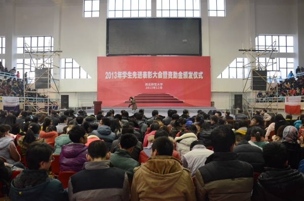 12月27日下午,kaiyun电子平台2013年学生先进表彰大会暨资助金颁发仪式在学校体育馆隆重举行。学校党委书记刘基,校长刘仲奎,党委副书记于树青,副校长万明钢、刘玉泉、丁虎生以及学校各部门、各单位、各学院有关负责人及师生代表近2000人参加会议。学校领导为获奖和受助师生代表颁奖。校长刘仲奎在会议上讲了话。会议由党委副书记于树青主持。
