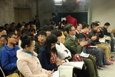 王鉴教授以论“学”开始,从“学”的甲骨文意象讲述学的意义,引申出学生、学习、学校、学术等词语的深厚古义,继而展开《学记》解读、启示等内容,向同学们讲解了这本影响中华文化发展和实践2300多年的经典,以概括先秦时期儒学思想、专门论述教育和教学问题的著作的当世价值。王鉴教授深入浅出、生动形象地将《学记》中描写的教育作用与目的、教育制度与学校管理、教育原则与方法以及教师与学生等问题做以详细解读,全面解析书中提出的教育、教学过程中必须遵循的原则和应该采用的方法,并将《学记》与四书(即《大学》、《中庸》、《论语》与《孟子》)、《师说》等著作相联系做以分析,讲述其文学内涵在生活实践中的实际意义。“《学记》对我们如何从师,如何做一个优秀的学生,如何进行教育管理都做出指导,让我们对以往的既定思维有新的发现和见解。”王鉴教授提及《学记》的现世价值时说道。