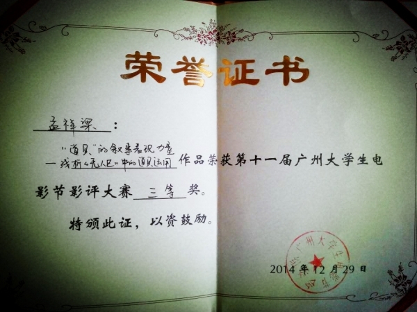 同时,孟祥梁还获得本届广州大学生电影节“我的银幕至爱”华语电影评选活动中幸运影迷奖,是西北地区唯一一位获本届广州大学生电影节等级奖项的西北大学生。