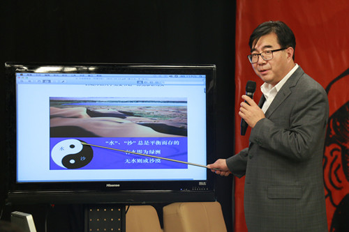 陈克恭教授随后深度讲解了他为什么提出用数理的方式来表达中国哲学太极思想的初衷。他首先介绍了他在张掖市任市委书记时所面临的天然绿洲和人造绿洲之间的矛盾,从而引发他关于生态文化的一系列思考。他来到西北师大后又一直在思考理论与实践如何结合方面的问题,即马克思主义与中国传统文化相结合,建设国家核心价值观的问题。他认为,马克思主义基本原理与中国传统文化最核心的学说《易经》中的一些原理是相通的,所以,通过研究马克思主义学说与中国传统文化可以解决今天中国的很多关键问题。同时,他还认为把中国传统文化传播到世界也面临一个媒介的问题,即中国人和西方人共同运用的语言,他便想到了西方哲学通用的数学原理。这就使他慢慢形成了文理科共同攻关来解决这些问题的构想。他说,现在他和马如云教授所做的工作仅仅是一个开始,同时也只是数学方面的研究,还应该有更多学科的人参与到其中来,才可能解决这些问题。