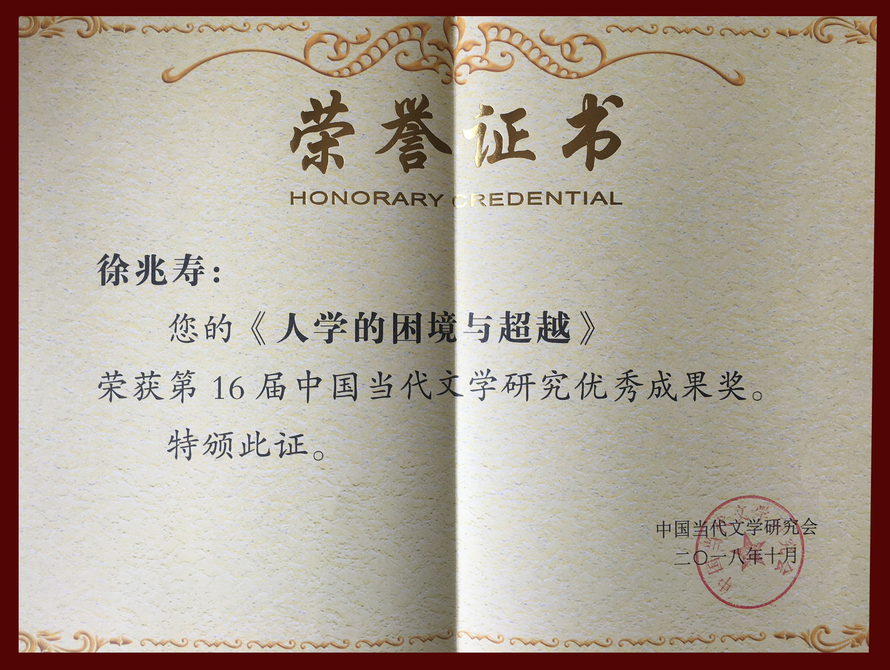 评委会的授奖词如下:徐兆寿的论文集《人学的困境与超越》视野开阔,文笔跳脱,在当代文学理论的“人学”命题与重要作家论两个方面,对新世纪文学的潮流与走向,都做出了有积极建设性的思考和评述;在行文上,融入思想者的沉郁,小说家的敏捷,有别于常规的论文体式,别具一格,可读可赏。特授予《人学的困境与超越》第16届中国当代文学研究优秀成果奖。