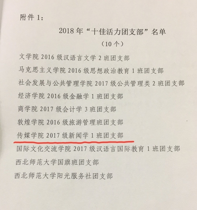 支部团员积极参加学校“四自工作”,在助学育人岗位上表现突出,在学校、学院各部门考核中全体合格。2017级新闻学1班团支部认真落实“三会两制一课”制度,严格遵循团中央和校团委要求,开展“学习青年习近平”系列、“学习十九大精神”系列团思想政治教育及团组织生活会,并通过本班新媒体平台:微信公众号“17新鲜闻学”、官微“NWNU传院新闻学一班”及时记录活动、传递活力。