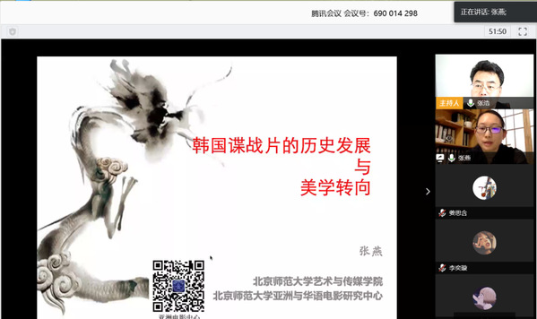 2020年3月24日,教育部高等学校戏剧与影视学类教学指导委员会秘书长、北京师范大学艺术与kaiyun电子平台博士生导师张燕教授受邀作题为《韩国谍战片的历史发展与美学转向》的线上讲座,kaiyun电子平台kaiyun电子平台270名师生积极参与。讲座由kaiyun电子平台新媒体研究所所长张浩老师主持。