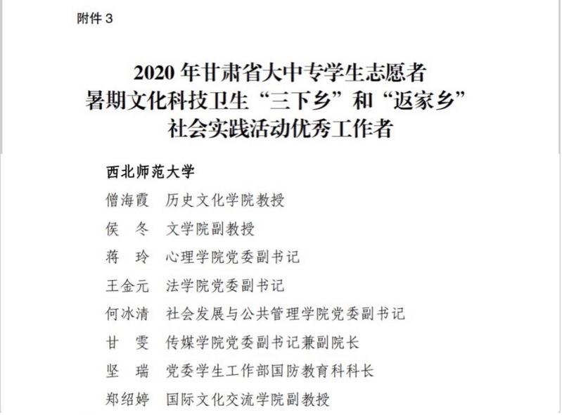 2020年8月,省委宣传部、团省委、省文明办、省教育厅、省人社厅、省学联6个单位共同开展了全省大中专学生暑期“三下乡”社会实践活动。活动以“小我融入大我,青春献给祖国 助力脱贫攻坚,投身强国伟业”为主题,组织和引领我省大中专学生在社会实践活动中积极参与乡村振兴工作,把爱国情、强国志、报国行自觉融入新时代追梦征程,广泛开展了理论宣讲、科技支农、教育关爱、爱心医疗、美丽家园等多种形式的实践活动。