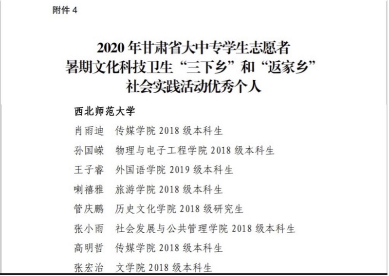 为推进“三下乡”社会实践活动持续深入开展,在实践育人中发挥更加突出的作用,省委宣传部、团省委、省文明办、省教育厅、省人社厅、省学联对在此次社会实践活动中有突出事迹的单位、团队、个人予以通报表扬。