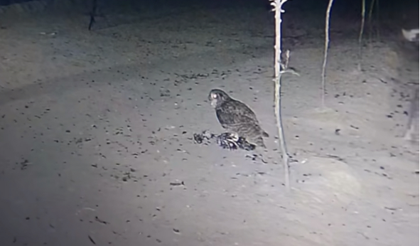 图为尚育康拍到猫头鹰偷吃鸡的画面
