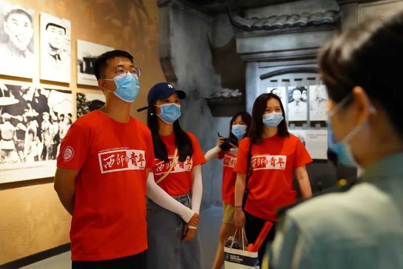 实践队员们正认真倾听讲解员讲解红军长征的历史