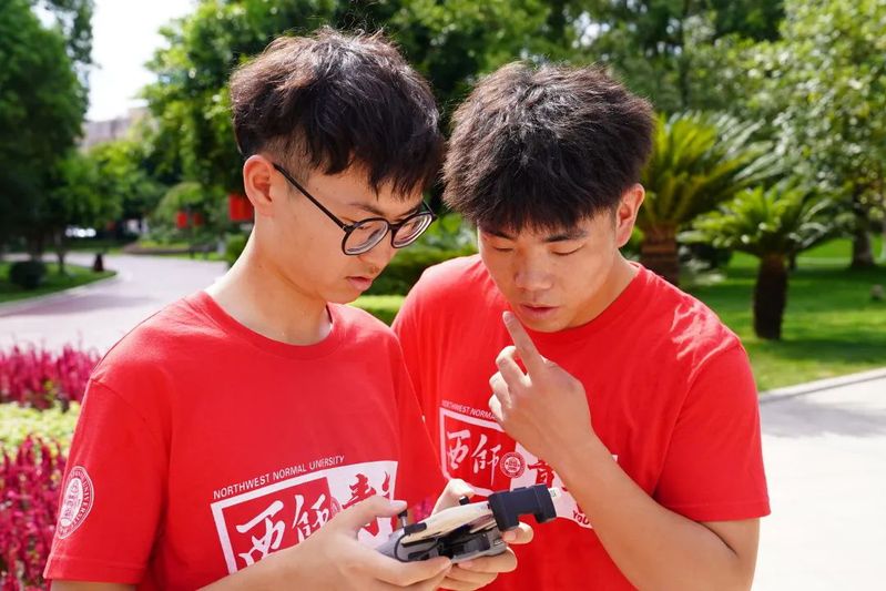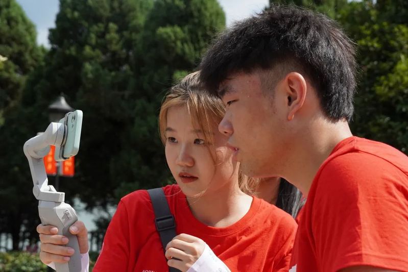 7月24日于都市最高气温为35℃,即便室外温度很高,实践队员们仍然克服困难,认真完成实践调研任务。图为实践队员楚玉珂、刘富坤、宋未涵正忙碌地进行拍摄工作,汗水已经浸湿了他们的衣襟,汗珠从脸上滑落。
