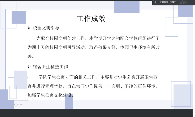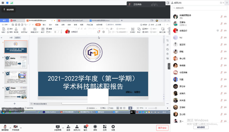 学术科技部负责人王襄怡从部门工作成就进行汇报,用数据反映该学年部门工作的进步,同时进行反思以得出改进意见,要求以服务学生为出发点,把满足学生需求放在首位,并提出对未来的展望。