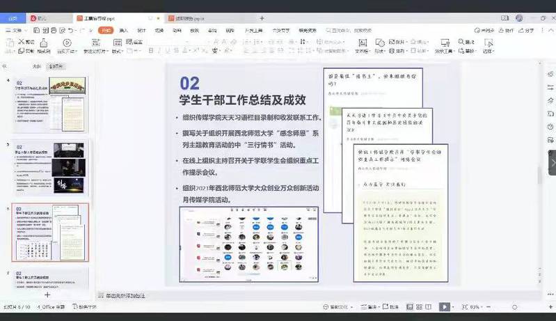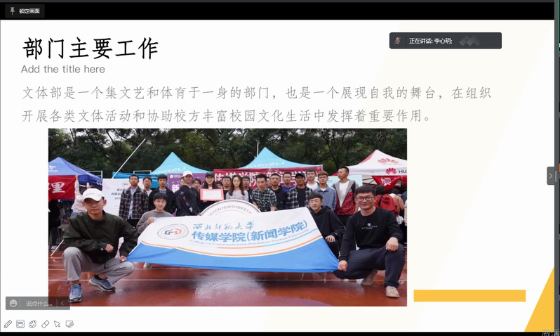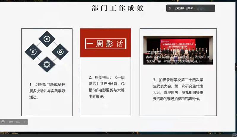 影视创作中心负责人王培彬用数据介绍了上学年部门在各活动中的视频拍摄制作成就,指出部门的待改进之处以及解决方法,在接下来的工作中力求创新、提高效率,增强部员的实践能力。