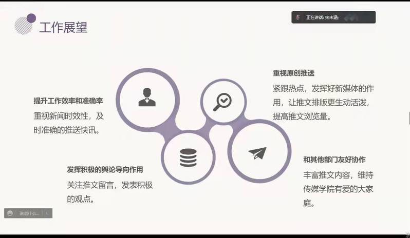 新媒体中心负责人宋未涵着重用公众号推文浏览量及原创板块浏览量展示新媒体中心本学期的工作成果,提出将继续提高推文时效性、推文排版质量等工作目标。