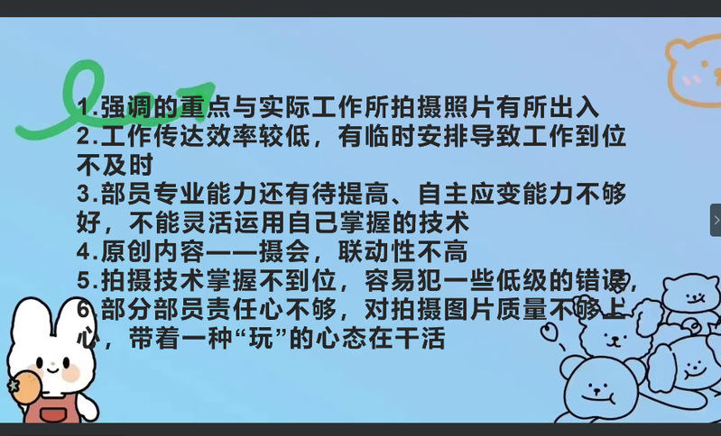 摄制部负责人陈安琪展示本学期摄制部拍摄各类会议及活动50余场、开设原创栏目摄会、组织多次部门会议等工作,反思照片质量不高、工作传达效率低、部员随机应变能力不高等问题,并对未来工作提出规划。