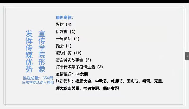 采编部负责人贾懿诗从工作分配、工作内容、不足与展望三个方面进行述职,展示了采编部的工作流程以及快速清晰传递学院消息、开设原创栏目等工作成效,并将继续努力提升部员的业务能力以及创新能力,加强与其他部门的工作配合,不断创新发展。