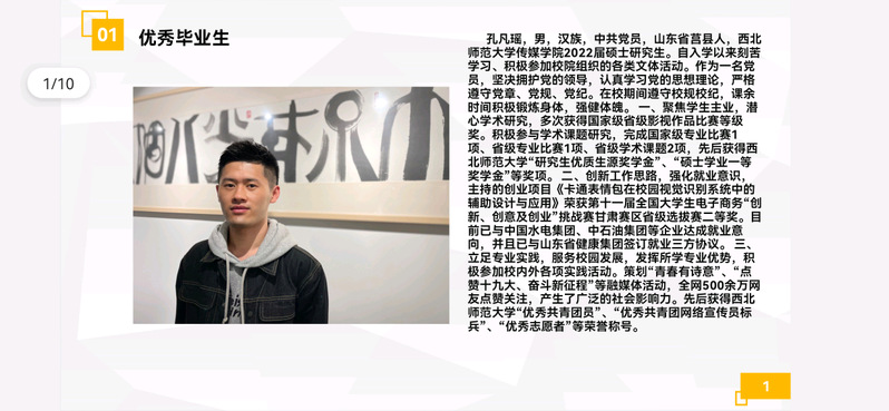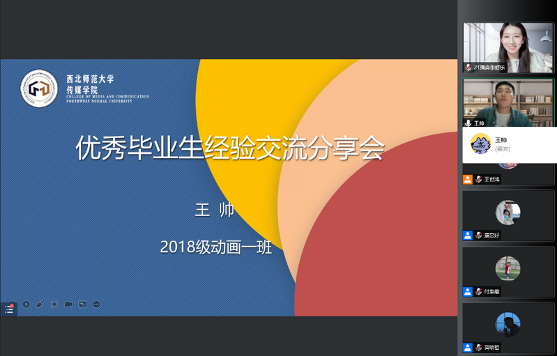 2022届动画专业本科生王帅向同学们介绍了自己丰富的社会实践活动以及专业实习经历,鼓励大家多参加实践活动,并表示在这些活动中会有意想不到的收获。他以“成功只有和勤奋作伴,才能如虎添翼”结尾,鼓励同学们敢于拼搏,去拥有一个无悔的大学生活。