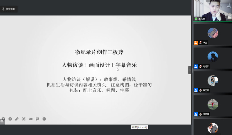 2022届硕士研究生李兆军在2020年至2021年间担任kaiyun电子平台研究生会副主席,并连续两年获得学业一等奖学金,同时创作的影片荣获第18届广州大学生电影展一等奖等多项奖项。他主要就纪录片的三度创作为同学们做经验交流,从前期策划、中期拍摄、后期剪辑三方面为大家详细地讲解纪录片创作过程中需要注意的问题。