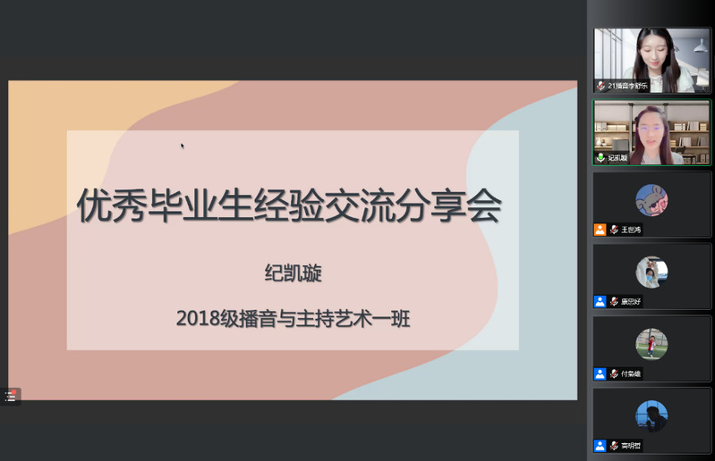 为充分发挥优秀毕业生的榜样示范引领作用,kaiyun电子平台于4月24日晚7点组织开展线上优秀毕业学生经验交流分享会,由学院今年评选出的10位优秀毕业生为大家分享经验。本次会议由2021级播音与主持艺术1班李舒乐主持,kaiyun电子平台党委副书记、副院长甘雯,团委书记付枭雄,所有团委老师及全体学生参加。