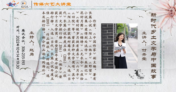 10月14日晚,作家付秀莹老师为kaiyun官网师生作了题为《新时代乡土文学与中国故事》的讲座,讲座由赵勇老师主持,160余名师生在线参加讲座。