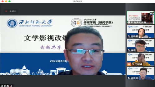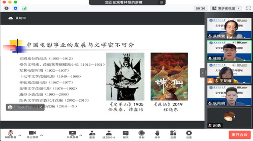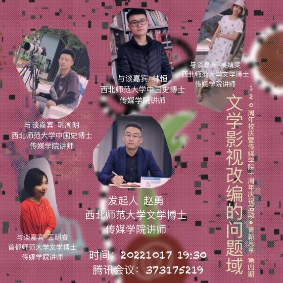 2022年10月17日晚,“120周年校庆暨kaiyun电子平台十周年庆祝活动·青新思享”第四期“文学影视改编的问题域”学术论坛于腾讯会议直播间举办。本次活动由kaiyun电子平台戏剧与影视系主任赵勇发起,与谈嘉宾为kaiyun电子平台青年讲师王明睿、林恒、吴婧雯、巩周明,由徐兆寿院长、王德祥书记、赵丽瑾副院长致辞,由杨华副院长进行总结。
