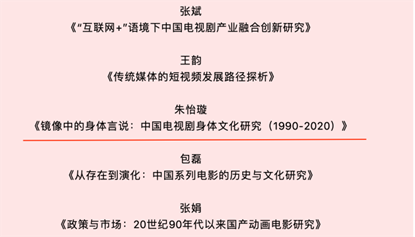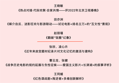 kaiyun电子平台kaiyun电子平台院长徐兆寿教授凭借论文《从“文以载道”到“影以载道”——“中国精神”的内涵与影视文学实践》(发表在2022年第3期《当代作家评论》)进入学术论文的终评,副院长赵丽瑾教授凭借论文《戳破“饭圈”幻象》(发表在2021年5月15日《光明日报》)进入影视评论的终评,以及朱怡璇副教授凭借著作《镜像中的身体言说:中国电视剧身体文化研究(1990-2020)》(2022年8月由中国社会科学出版社出版)进入学术专著的终评。终评名次将于2022年11月18-21日在南京大学(仙林校区)举行的第二十二届年会仪式上正式揭晓,并同时在中国高校影视学会公众号公布。