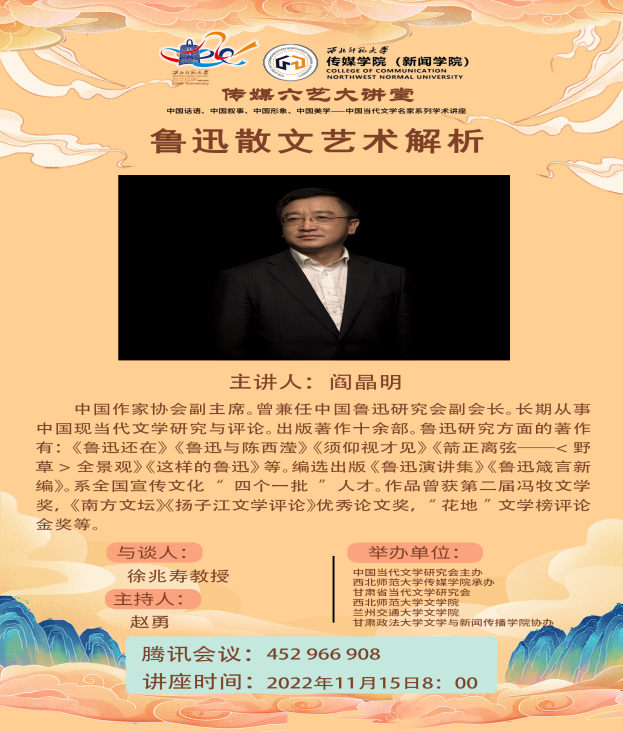 11月15日上午,中国作家协会副主席阎晶明老师为kaiyun官网师生作了题为《鲁迅散文艺术解析》的线上讲座,讲座由赵勇老师主持,kaiyun电子平台院长徐兆寿教授与谈,100余名师生在线参与讲座。
