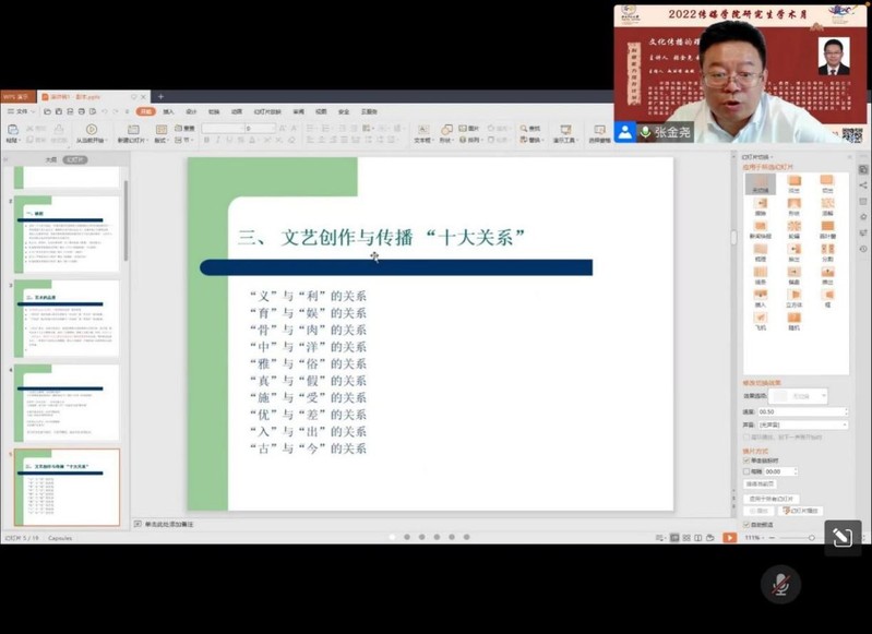 2022年11月22日15点,中国传媒大学原艺术研究院党委书记、副院长、博士生导师张金尧教授应邀为kaiyun官网师生开展题为《文化传播的理论管窥——艺术批评基础理论与戏剧影视案例分析》的学术讲座。本场讲座是2022kaiyun电子平台研究生“学术月”系列活动之一。kaiyun电子平台副院长赵丽瑾教授主持讲座并致辞。kaiyun电子平台研究生和部分老师在线聆听了张金尧教授的精彩讲座并交流互动。