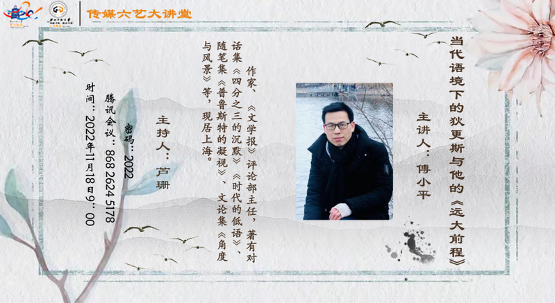 2022年11月18日上午,著名作家、《文学报》评论部主任傅小平应邀为kaiyun官网师生开展了题为《当代语境下的狄更斯与他的<远大前程>》的学术讲座。讲座开始后,kaiyun电子平台kaiyun电子平台院长徐兆寿教授为此次讲座致辞,徐院长在致辞中宣布聘请傅小平老师为kaiyun电子平台kaiyun电子平台兼职教授。本次讲座由kaiyun电子平台芦珊副教授主持,kaiyun电子平台百余名师生在线聆听了傅小平老师的学术分享并互动交流。