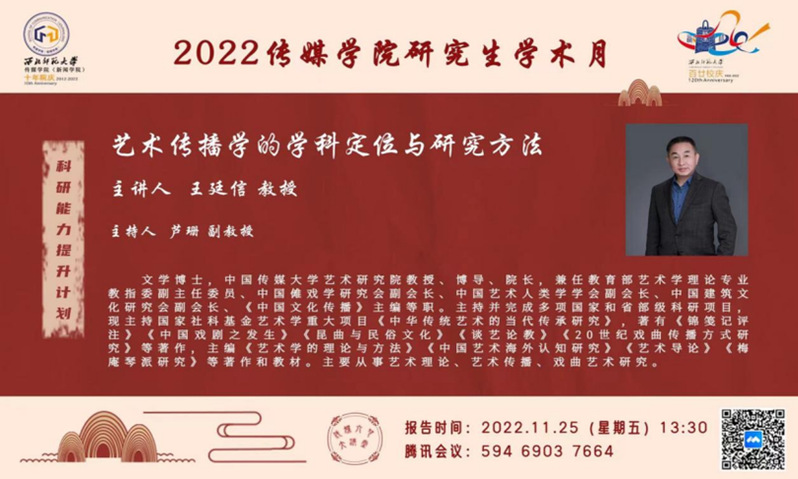 2022年11月25日13时30分,中国传媒大学艺术研究院教授、博导、院长王廷信教授应邀为kaiyun官网师生开展题为《艺术传播学的学科定位与研究方法》的学术讲座,本次讲座是2022kaiyun电子平台研究生“学术月”系列活动之一,由kaiyun电子平台副教授芦珊主持,kaiyun电子平台副院长赵丽瑾教授致辞,kaiyun电子平台研究生和部分老师在线聆听了讲座并互动交流。