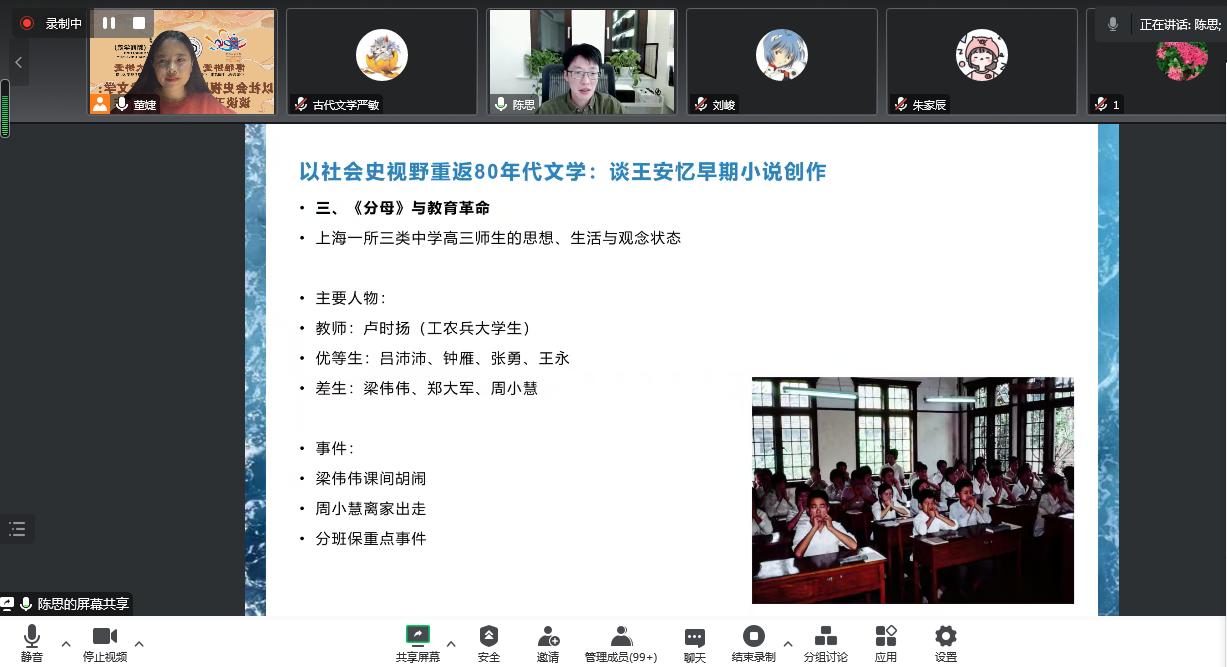 讲座伊始陈思便抛出“悬念”:在惯常的、线性的文学史叙述之外,如果换一种“社会史视野”的方法论,会不会得到“有别于文学史的对文学的判断”?围绕这一讲座悬念,陈思首先提到了王安忆的早期小说《雨,沙沙沙》,并指出王安忆将特定的历史讯息作为创作媒介与“自我情绪的小说”相勾连的事实,以及对社会历史的“自我判断”的发抒。紧接着陈思以王安忆的《分母》为例,细致地分析了其折射的“教育革命”问题:新的身份政治——红与专的重新定义,失落的意义感与连带感,“教育内卷”起点与待业青年问题。同时,又兼及诸如人生的路的讨论、“升学率”的问题、80年代个人主义的残缺感等重大意义的问题。