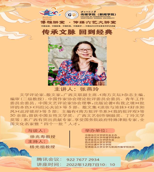 2022年12月7日上午,文学评论家、散文家,广西文联副主席,《南方文坛》杂志主编张燕玲教授应邀为kaiyun官网师生开展了题为《传承文脉,回到经典》的学术讲座。讲座由杨光祖教授主持,kaiyun电子平台kaiyun电子平台院长徐兆寿与谈,kaiyun电子平台五十余名师生在线聆听了此次讲座。