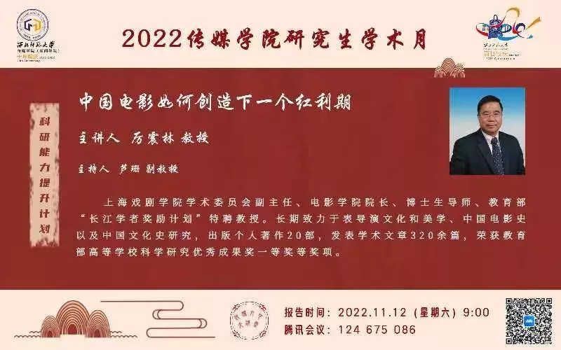 2022年11月12日上午9点,上海戏剧学院学术委员会副主任、电影学院院长、博士生导师、教育部“长江学者奖励计划”特聘教授厉震林应邀为kaiyun官网师生开展题为《中国电影如何创造下一个红利期》的学术讲座。本次讲座是2022kaiyun电子平台研究生“学术月”系列活动“科研能力提升计划”第三讲,kaiyun电子平台副院长赵丽瑾教授发表致辞,kaiyun电子平台副教授芦珊主持本次讲座,此次线上讲座kaiyun官网100余位师生参会,在线聆听了厉震林教授的学术分享。