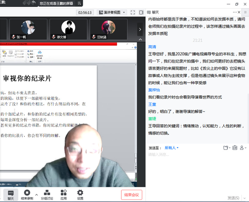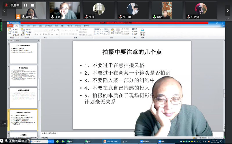 除了详实的理论分享,王鹏导演还带领师生在线观看了《寻找雪豹》和《新无人区》等纪录片的开头片段,以具体案例为kaiyun官网师生传授了纪录片点题的“直切”法。同时分享与拍摄对象建立信任的过程,为师生规避纪录片拍摄的常规问题和如何拍出成熟的片子作了思想引导和实践总结。