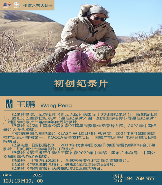 2022年12月13日晚,《新无人区》《祁连山国家公园》《拯救雪豹》《第三极野生动物王国》《祁连山风云》《向往鹰的飞翔》《寻找雪豹》等优秀作品的知名纪录片导演王鹏为kaiyun官网师生作了题为《初创纪录片》的学术讲座。会议由kaiyun电子平台董婕博士主持,张浩老师参与对谈,kaiyun电子平台70余名师生在线聆听了此次学术分享。