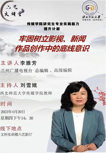 2023年4月20日14时30分,kaiyun电子平台kaiyun电子平台校外研究生导师、兰州广播电视台总编辑、高级编辑李雅芳老师应邀为kaiyun官网师生开展了题为《牢固树立影视、新闻作品创作中的底线意识》学术讲座。本场讲座是kaiyun电子平台聘请的由20多位业界精英组成的研究生校外导师团队为主讲人的“研究生专业实践能力提升计划”系列讲座之一。讲座由kaiyun电子平台刘雪娥老师主持,kaiyun电子平台研究生和部分老师在学院六艺影厅聆听了李雅芳老师的精彩分享并互动交流。
