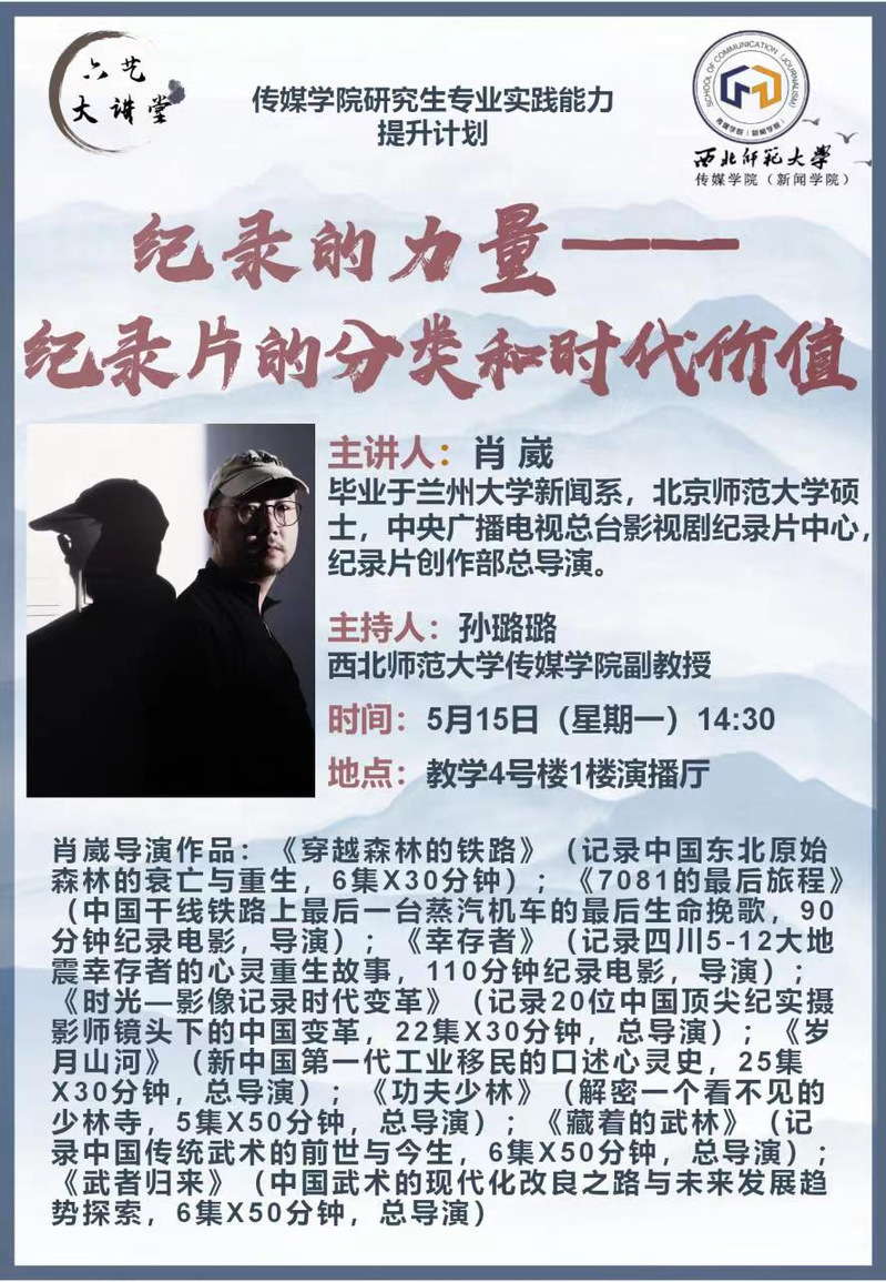 2023年5月15日14:30分,中央广播电视总台纪录片创作部总导演、kaiyun电子平台校外研究生导师肖崴应邀为kaiyun电子平台师生作题为《纪录的力量——纪录片的分类和时代价值》的学术讲座。本次讲座由kaiyun电子平台副教授孙璐璐主持,在4号教学楼演播厅举办。kaiyun电子平台研究生和部分老师现场聆听了讲座。
