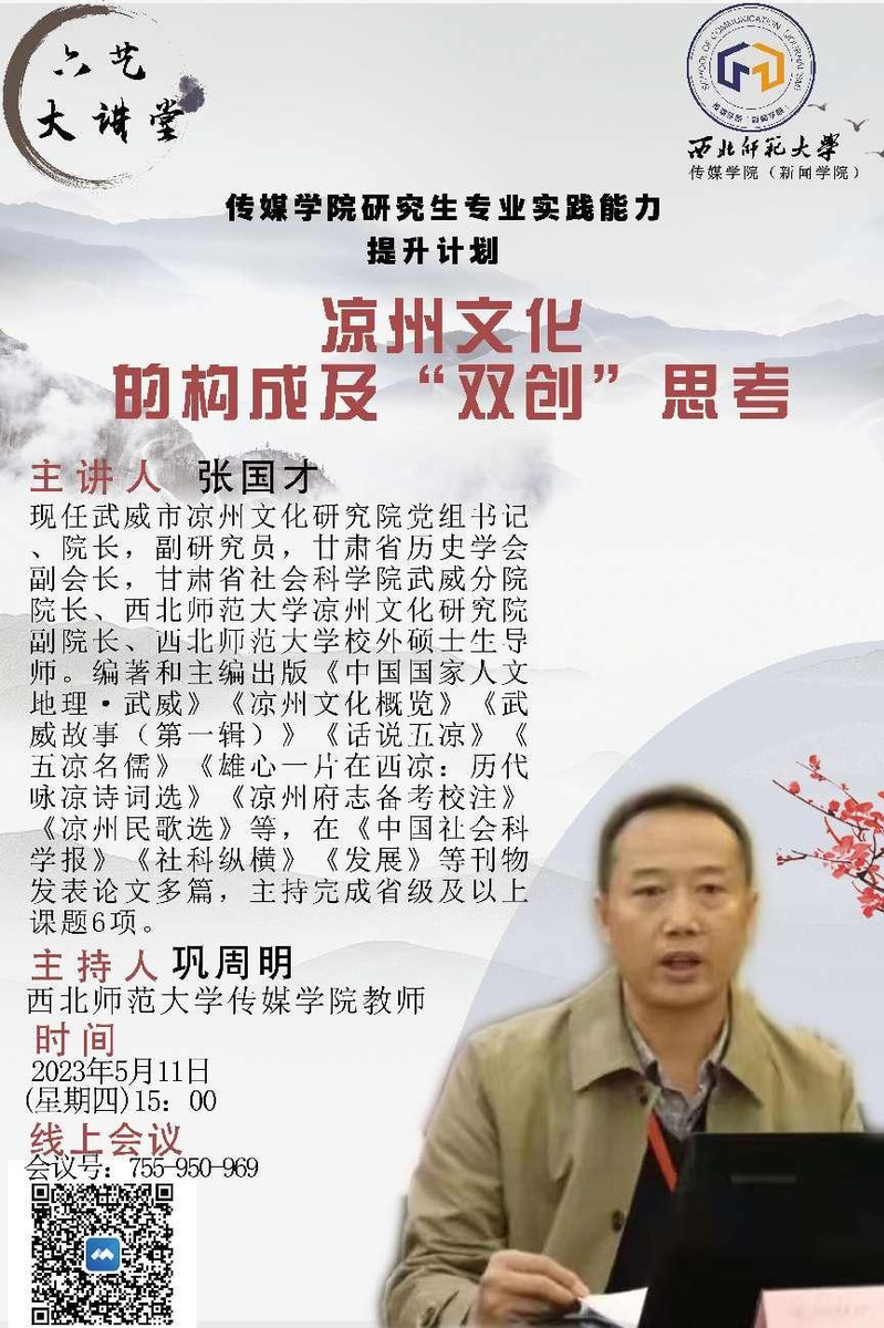 2023年5月11日下午3时,武威市凉州文化研究院党组书记院长、副研究员、甘肃省历史学会副会长、甘肃省社会科学院武威分院院长、kaiyun电子平台凉州文化研究院副院长、kaiyun电子平台校外研究生导师张国才为kaiyun官网师生做了题为《凉州文化的构成及“双创”思考》的线上学术讲座,由kaiyun电子平台巩周明老师主持,kaiyun电子平台研究生和部分老师聆听了线上讲座。