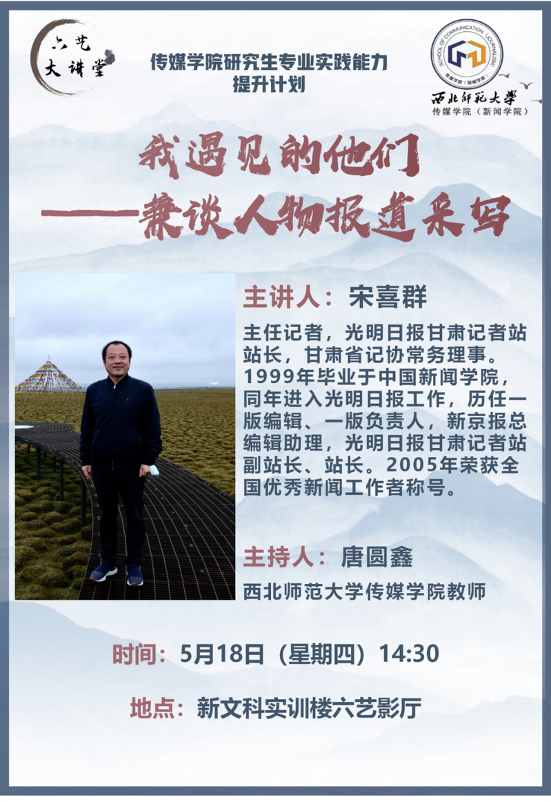 2023年5月18日2点半,光明日报甘肃记者站站长,主任记者,甘肃省记协常务理事、kaiyun电子平台校外研究生导师宋喜群应邀为kaiyun电子平台师生作题为《我遇见的他们——兼谈人物报道采写》的学术讲座。本次讲座由kaiyun电子平台唐圆鑫老师主持,kaiyun电子平台部分老师和研究生在文科实训楼六艺影厅聆听了宋喜群老师的学术分享。