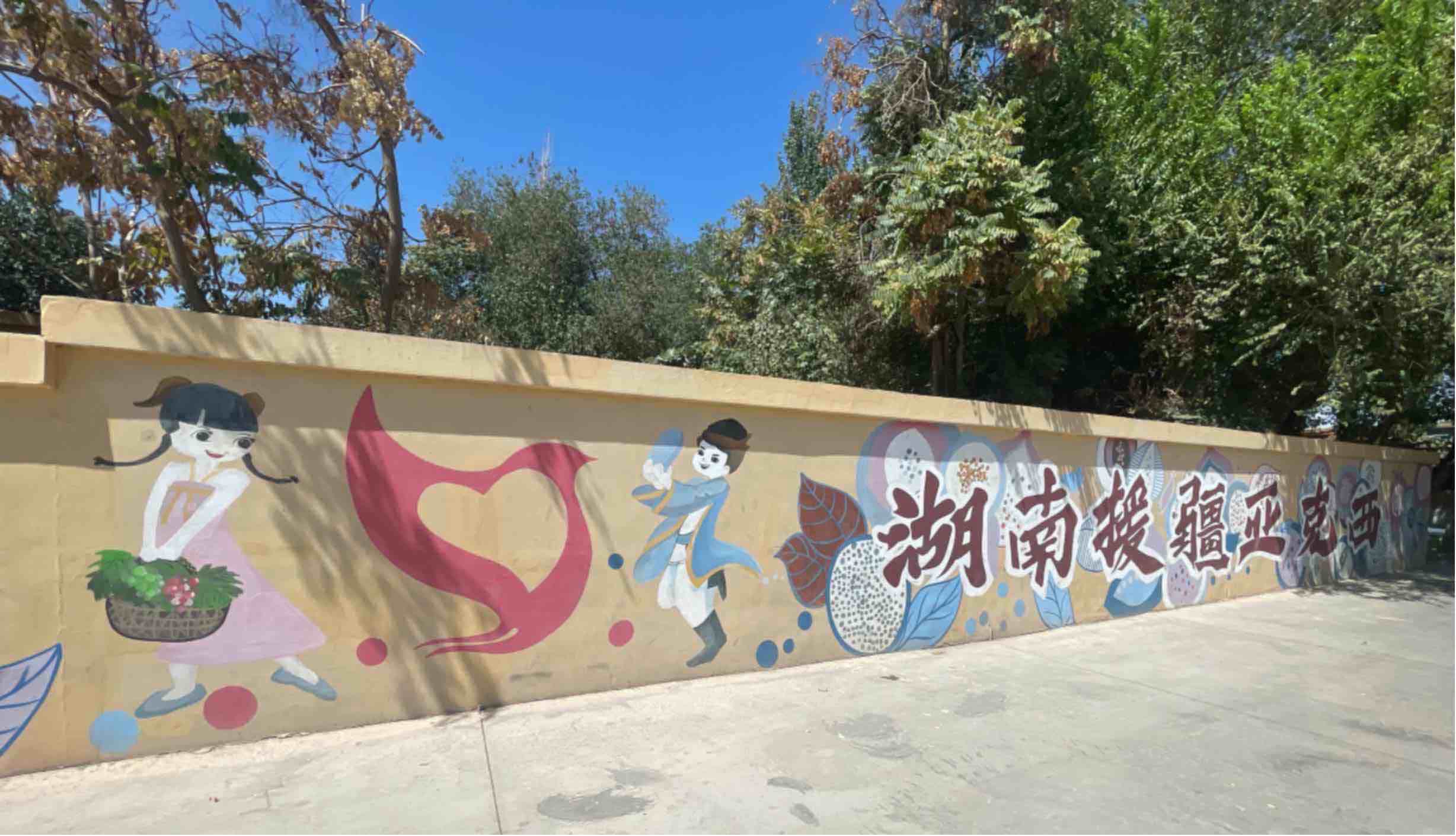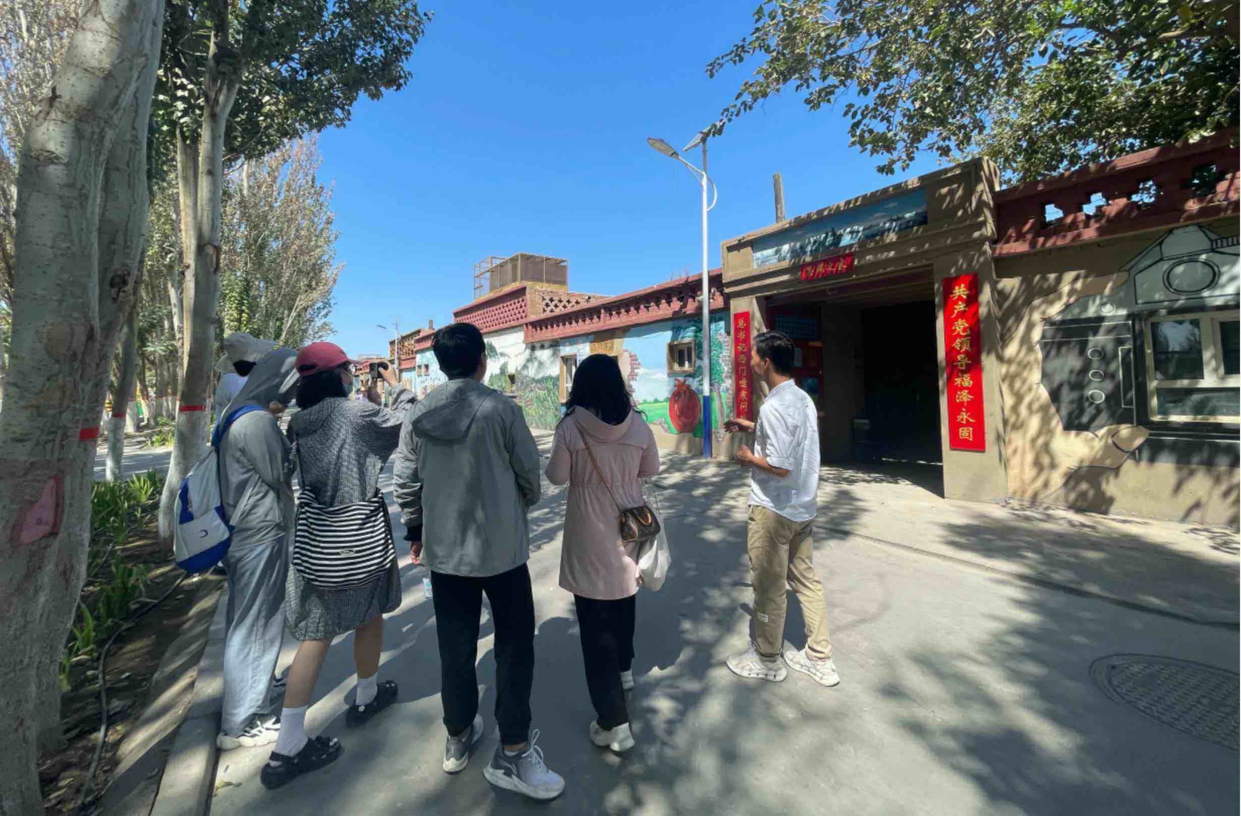 艾山江告诉实践团成员们,从2020年9月开始,湖南省花垣县十八洞村与新城西门村结成民族团结乡村振兴结对共建村。三年来,湖南省援疆前方指挥部以“南看十八洞、北看西门村”为目标,统筹“一心引领、一轴串珠、四片联动、多点融合”总体布局,全力将新城西门村打造成全国乡村振兴示范村、铸牢中华民族共同体意识示范村、精准援疆示范村。以发展村级产业为重点,带动当地群众持续增收致富,全面促进乡村振兴。