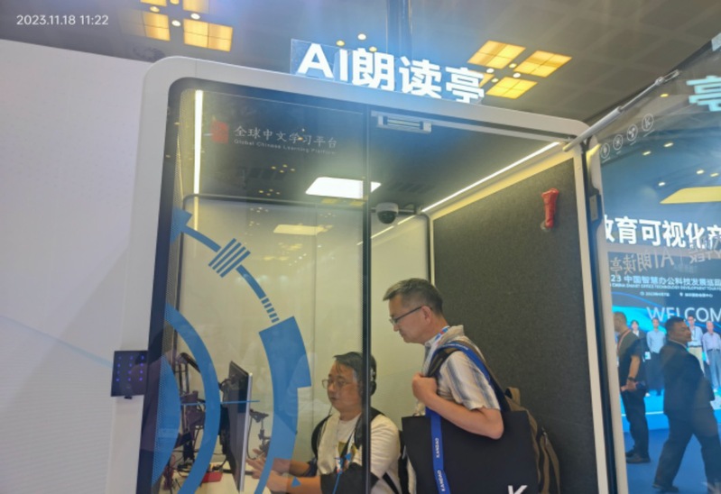展览会中教师一行还参观了AI朗读亭,这是基于新技术的自动语音识别并纠正语音错误的朗读静音舱,内设专业的朗读耳机、麦克风、隔音毡、低噪声涡轮新风系统等设施等,在这个空间里,学生可以大胆张口,锻炼自我。从发音练习到文章朗读,AI朗读亭都可以提供实时的纠错识别,对于播音学生的语音练习非常便捷、高效。另外还有一款AI双屏360°视频会议一体机,自动跟踪会议发言人员,动态识别并跟踪切换景别和主显示界面,这些科技成果都展现了当下AI的最新发展。