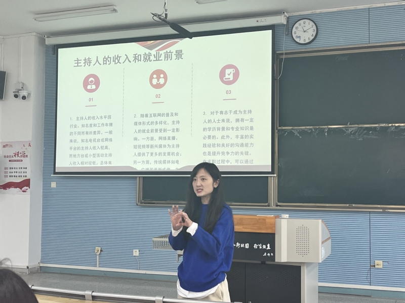 郑雪以“播音员的收入和就业前景”作为切入点,结合当前社会就业形势以及自身从业经验,为师生们讲述了“主持人、记者就业发展”“新媒体主播就业发展”和“演员就业发展”等相关话题,内容详实,生动有趣,使同学们对媒体行业就业现状有了大致的了解。在讲座总结环节,郑雪强调“先就业再择业”的观念,帮助同学们树立灵活的就业观。