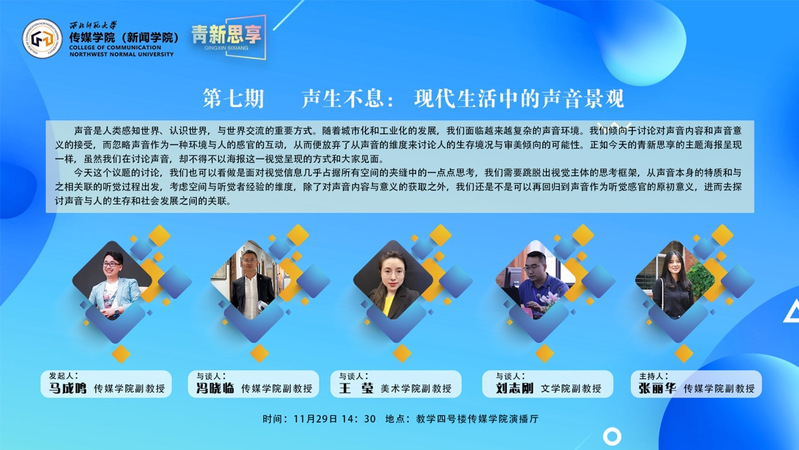 11月29日下午,kaiyun电子平台kaiyun电子平台 “青新思享”论坛第七期“声生不息: 现代生活中的声音景观”在演播厅举行。该论坛作为kaiyun电子平台的品牌活动之一,旨在新文科背景下,邀请不同学科、不同院系、不同学校的青年教师通过群体座谈会的形式,就当下热点现象、议题在交叉、融合、碰撞中展开探讨,以促进学术交流,回应时代需求。